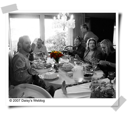 與家人共度感恩節今天是感恩節。和去年一樣,我們準備了簡單的行李,一家「四口」(是的,我們總是帶著狗隨行) 快快樂樂地回家過節,預計明天晚上再回西雅圖。今年的感恩節比往年熱鬧,我們有機會和 Aunt Martha,Uncle Glen 和他們女兒 Allison 一起度過,還很有口福地嚐到 Aunt Martha 親手做的派。Aunt Martha 是婆婆的妹妹,二人都遺傳了母親的好廚藝,特別擅長烘培,讓我很羨慕。小姑 Wendy 今年準備了一個造型很可愛的餐後甜點果凍,我也帶了餐前小點 Smoked Salmon Dip (煙燻鮭魚沾醬,作法請看【Smoked Salmon Dip】跟餅乾,主菜烤火雞和其他的菜餚就由公公和婆婆負責。看著公公用電動切肉機切著焦脆好看,嫩滑多汁的火雞時,我不由自主地感到焦慮起來。我跟 Aunt Martha 坦承我到現在都沒烤過一隻火雞,哪一天婆婆若不再烤火雞給我們吃,恐怕我們家的感恩節上就見不到主角囉! Aunt Martha 安慰我,說她第一次烤火雞時也很緊張,拼命地打電話回家向媽媽求救,烤了幾次失敗的火雞後也終於開了竅,叫我不要擔心。雖是有一天我也得學著自己烤火雞,準備感恩節大餐,現在年年有婆家回的感覺還真是好!不但不必擔心要如何變出香嫩的火雞和美味的派點,還有公婆搶著陪孩子玩,讓外子和我可以名正言順地偷懶一下,真是很不錯呢!Wendy 作的米老鼠造型果凍Papa (阿公) 和三個寶貝蛋