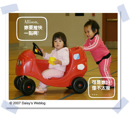 加恩和她的好朋友 Allison下午和好友 Grace 帶著 Allison 和加恩二個小朋友參加附近社區中心的 playgroup (學齡前的小朋友一塊兒玩耍的活動團體) 。Grace 的女兒 Allison 雖然不過才大加恩五個月,卻像大姐姐一樣地照顧加恩,不但把餅乾分給加恩吃,還忙著幫她推車車,令人不得不為小 Allison 的懂事與乖巧感到訝異。
