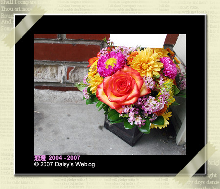 今天早上九點鐘左右接到了一通電話。電話裡的人聲音聽起來有點遙遠,讓我一下子認不出來是誰。「我是媽媽!」,她說。原來和公公正在義大利旅遊的婆婆記得今天是我的生日,特地在當地的傍晚六點打電話給我,跟我道聲「生日快樂!」。婆婆說她和公公都很遺憾今年沒能趕在我生日之前幫我慶生,看來只好等回來後再補。我說不打緊,最重要的是他們這趟旅程能玩得開心。婆婆問我今天晚上可有慶祝活動?我回答 : 「應該是沒有。最近我們二個都很忙,今天晚上我也有課,大概就只好等到週末囉!」和媽媽愉快地閒聊了一會兒後,我們掛了電話。正準備念一下書給女兒聽的時候,小姑 Wendy 也打電話過來跟我祝壽。Wendy 問我晚上做什麼?我同樣不以為意地告訴她我們並沒有計畫,只是 Wendy 聽了之後開始對我表示同情 ( 註 1.),讓原本沒事的我竟然跟著悲從衷來。下午我帶著女兒從附近的公園回來,意外地在家門口發現一個可愛的生日花籃 (Birthday Bouquet) 。「啊! 莫非是夫婿給我的驚喜,趁上班的時候偷打電話請人送來的禮物?」我感動地一手把女兒『推』入家門,一手拎著花籃快步走進客廳,為的是好好坐下來欣賞一下我的生日花籃。打開卡片一看,上面寫著 :Happy Birthday!