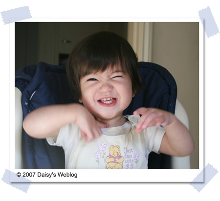 小寶貝今天滿十五個月了。現在的她很頑皮,每天忙著把家裡弄亂。常常把東西弄倒了之後卻一臉無辜地看著我說: 「Oh! Oh !」,像是報告媽咪自己又惹禍似的。她還很喜歡模仿大人,聽見我們說話時總喜歡跟著「對對對…」、「屁」(是誰放屁?)、「看」(給媽咪看看!)。爸爸媽媽作謝飯禱告時,她也會跟著合手咕嚕咕嚕地『禱告』,然後很高興地大聲地說 :「們!」(阿們, Amen),令人發噱。因為如此,爸爸和我都深刻地瞭解到父母身教言行的重要。如果你希望孩子快樂,父母應該避免在孩子面前爭執。如果你不希望孩子將來對你說謊,父母自己也不能說謊,哪怕是所謂的小謊。加恩很喜歡和小孩子在一起。看到幾個小朋友在那裡,總快步地跑過去「哥哥! 哥哥!」地叫人家。可惜大部份的美國小孩子是聽不懂她的中文的,通常一臉「@&!*%#?」地看著她。不過我喜歡她個性中的熱情和友善,所以即使別人可能認為她是個奇怪的外星來的孩子,我也不想阻止她。這個月她又多了一些字彙,包括: 肉肉、麵麵、喝、吃、叔叔、姨姨、姐姐、洞洞、門、褲子、扣子、書、加加 (說自己的名字)、出去、車車、摸摸、kiki (米老鼠,Mickey Mouse)、 nana (香蕉, banana) 、juju (果汁, juice) 、shoe (鞋子) 、key (鑰匙) 和數字 8 等。能夠辨認並指出的身體部位包括 : 頭髮、頭、眼睛、鼻子、鼻孔、牙齒、舌頭、手、腳和肚臍。