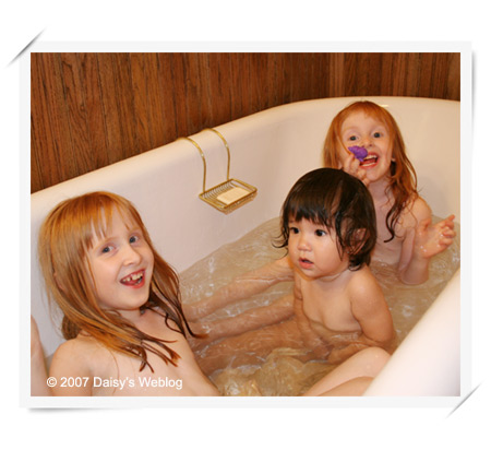 【難得一起洗澡的三姐妹】今天和外子帶著孩子回家看公婆。到了之後發現家裡多了二位小客人 Alexandra 和 Casandra,一問之下才知道原來 Wendy 和 Jerry (我的小姑和她的先生) 去參加一個「婚姻家庭講座」(Marriage Conference),這個週末兩個小姑娘就由他們二老幫忙照顧。 婆婆看起來有點疲憊,話也比平常少,但是還是在廚房裡忙進忙出地為我們準備晚餐。我問婆婆有沒有什麼我可以幫忙的,她扶著腰桿搖頭表示沒有,但是苦笑說這兩天照顧二個小妮子竟然就搞得腰酸背痛的,看來自己真是年紀大囉 !晚飯過後,我馬上向外子打眼色示意,要他幫忙收拾碗盤,又叫媽媽只管去休息,待會兒幫小朋友洗澡的事就交給我。婆婆聽了似乎很感動,還連說好幾聲的「謝謝」。趁著外子在廚房時,我又走過去小聲地慫恿他碗洗好後去幫婆婆按個摩。結果這個四十歲的大男人竟一下子忸怩起來,搖著頭直說不要。當然他最後還是禁不住我的三寸不爛之舌,終於同意了,只是不准我看。我幫三個孩子洗完澡又擦好身後,果然看到婆婆走進書房,心花怒放地向公公炫耀剛剛寶貝兒子幫她按摩的功夫有多棒,現在腰痛幾乎都不藥而癒了。從來沒享受過這樣的待遇的公公聽聞這件事後既驚訝又羨慕,讓我看了在一旁暗笑不已。公公好奇問她,兒子到底是如何幫她按摩的?婆婆笑著回答說是用腳。我聽了忍不住想糗外子,小聲地對他說 :「呦! 看來『腳動按摩器』不是我個人專用的呢!」(請看【沒有天生的好男人】) 外子咧嘴微笑說:「但是妳是第一個人囉!」