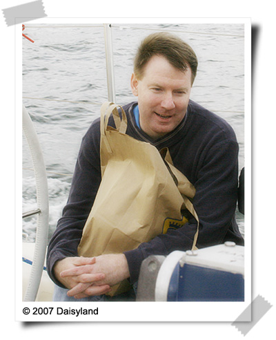 大概是平常懸疑偵探片看多了,聶先生其實是個非常難騙的人。過去幾天來 Bo 和我也有數次幾乎穿鞤的經驗 (比方 Bo 打電話來剛好被聶先生接到,聶先生不明白我為什麼今天一定要在下班交通尖峰時間開車到 Waterfront 附近專門賣一些怪裡怪氣的東西的 Ye Olde Curiosity Shop 『提貨』等等),不過我們終於還是成功地誘騙聶先生,順利地在 Waterfront 『巧遇』,也及時搭上了帆船。這才發現,原來細心的 Bo 不但巧心安排了今天的節目,還準備了香檳、三明治和點心等,讓我們覺得很窩心。
