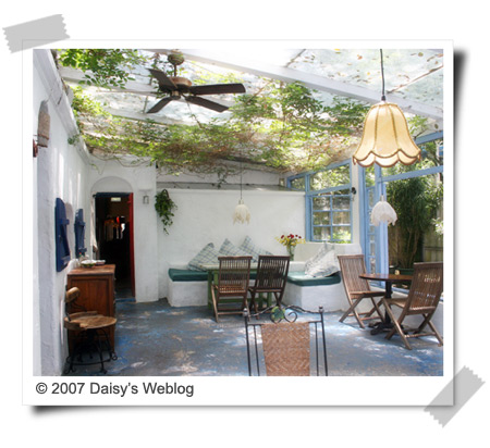 「秘密花園」的透明的玻璃屋頂、白色的屋身和藍色窗框。今天有機會和大姐、二姐、阿姑 (大姐的小姑),和幾個小蘿蔔頭一起到陽明山上的「秘密花園」用餐。正如其名,隱身在菁山路旁的「秘密花園」同時具有浪漫與神秘的氣息。入口處可見一道石磚砌成的拱門,穿過石門後是一座爬滿藤蔓的階梯,有股引人一窺究竟的神秘力量。走上階梯後,映入眼簾的即是人氣餐廳「秘密花園」─ 透明玻璃屋頂、白色屋身、藍色窗框,有如童話書裡的夢幻小屋,十分特別。這座宛若歐式花園的咖啡館的特色之一是它結合了自然山林,不但隨處飄散著悠閒的氣息,每個角落也都佈置得十分地浪漫雅緻。遊走其中,頗有置身於一座靜謐美麗的夢幻花園之感。秘密花園的前身據說是個戶外攝影棚。餐廳經營人原為專業攝影師出身,起初蓋建這個建築物的目的主要便是為了搭景拍攝所用。之後隨著知名度的提昇,吸引了許多媒體前來取景和民眾的參觀,開始增設咖啡座,供應餐點。秘密花園所提供的主要是西式風格的餐點,多元的餐點包括主餐、咖啡、花茶,以及各式點心等。在這裡享用餐點,所獲得的不只是味蕾上的滿足, 更是一席視覺和心靈的最佳饗宴呢!洋溢文藝氣質的咖啡館室外一景 花園一隅